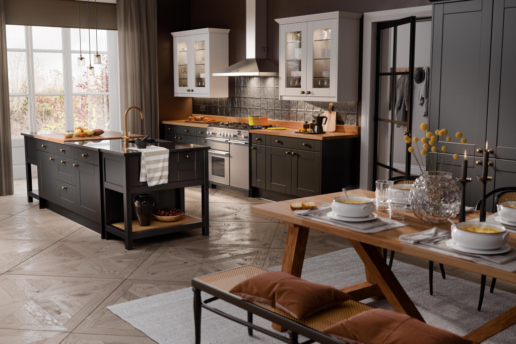 温暖和深色木纹又回到了Wren自然主题元素系列的丰富胡桃木台面和意大利纹理橱柜。