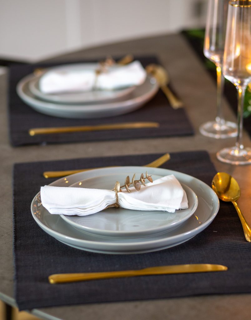 坚持使用忧郁的调色板,把餐具垫和桌布搭配起来。我们使用了与我们的桌布相同的织物和质地的黑色餐垫作为我们稍浅色调的陶器的基础。金色的餐具与黑色的餐垫形成鲜明的对比,将金色元素融入到餐具中。金边玻璃器皿是一个时尚的选择,与金色的餐具和烛台优雅地搭配。把剩下的金色桉树树枝缠在餐巾上,完成餐桌的装饰。