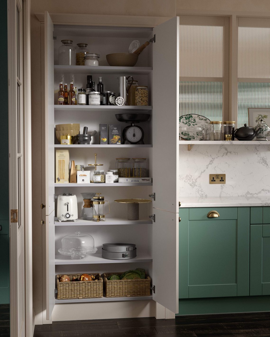 开放的架子是完美的地方来存储你喜欢看,经常使用的东西。如果你已经有货架,那么为什么不重新评估什么是存储在他们让他们更好的为你工作,以及看起来整洁和有吸引力吗?在厨房里,交换旧小说配方和教育书籍,把一个设备,不要忘记你的美丽的植物。如果你没有架子,计划到你的新厨房。