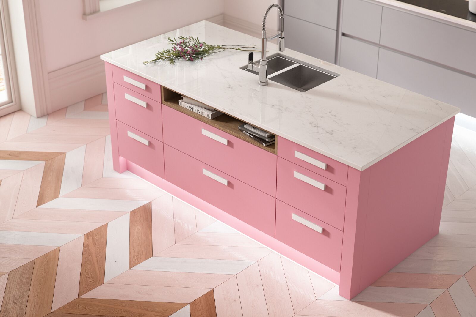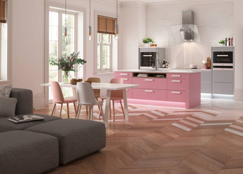 如果你正在寻找功能雅致,我们米兰轮廓设计色彩的完美画卷。漂亮和实用空间,贝克米勒粉红色的单位和大教堂灰色。完整的外观与米开朗基罗石英工作台和温暖的橡木色调来创建一个复杂的空间。