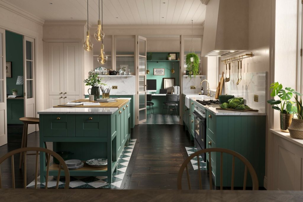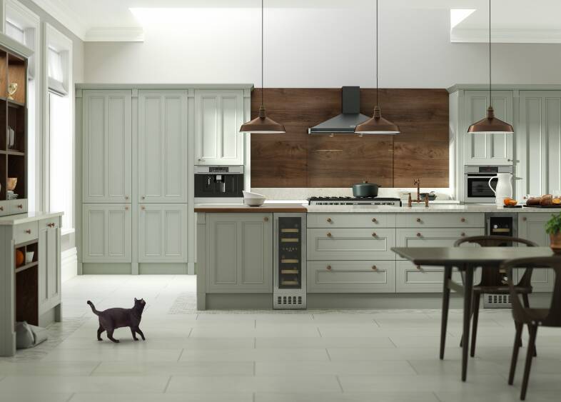 的简单的瓶框架是一个永恒的风格,作品在各种各样的颜色。就在最近,我们无限+瓶厨房,然而色彩的翡翠和软棉、加冕厨房的2021年。这暗的绿色增添了新鲜的完成和充满活力的流行色彩的乡村式的橱柜。终极时尚的收尾工作,结合软石灰色和温暖的铜配件。