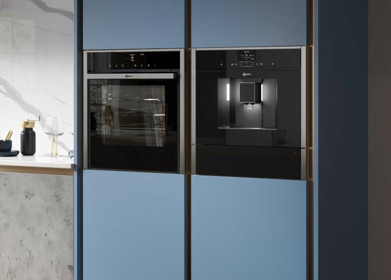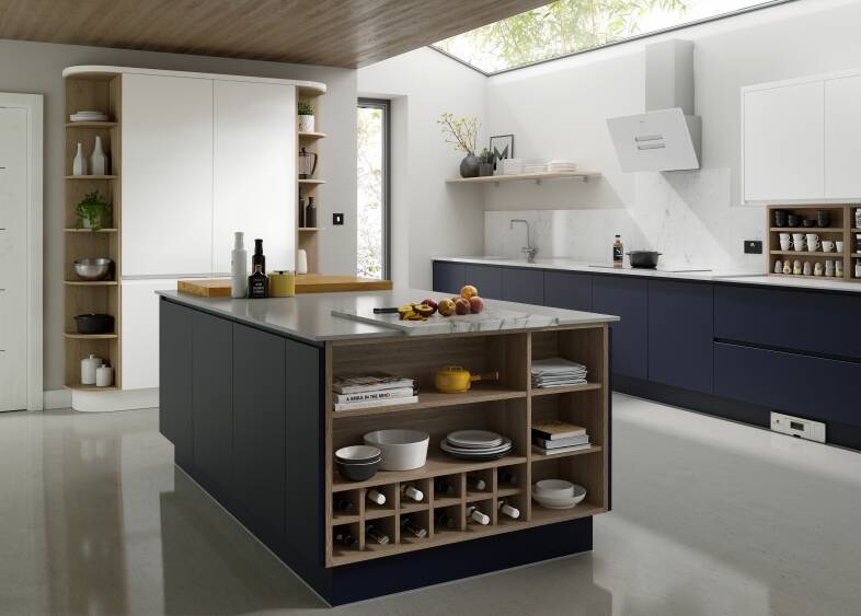 深,戏剧性的蓝色音调创建一个声明的中心枢纽。厨房的实用而时尚,我们的煲范围是一个选择。蓝色的调色板,包括波罗的海、蓝莓和抽蓝,将创建一个哇因素结合这圆滑的设计。完成看月球灰色石英工作台或金属银元素的超现代的厨房。