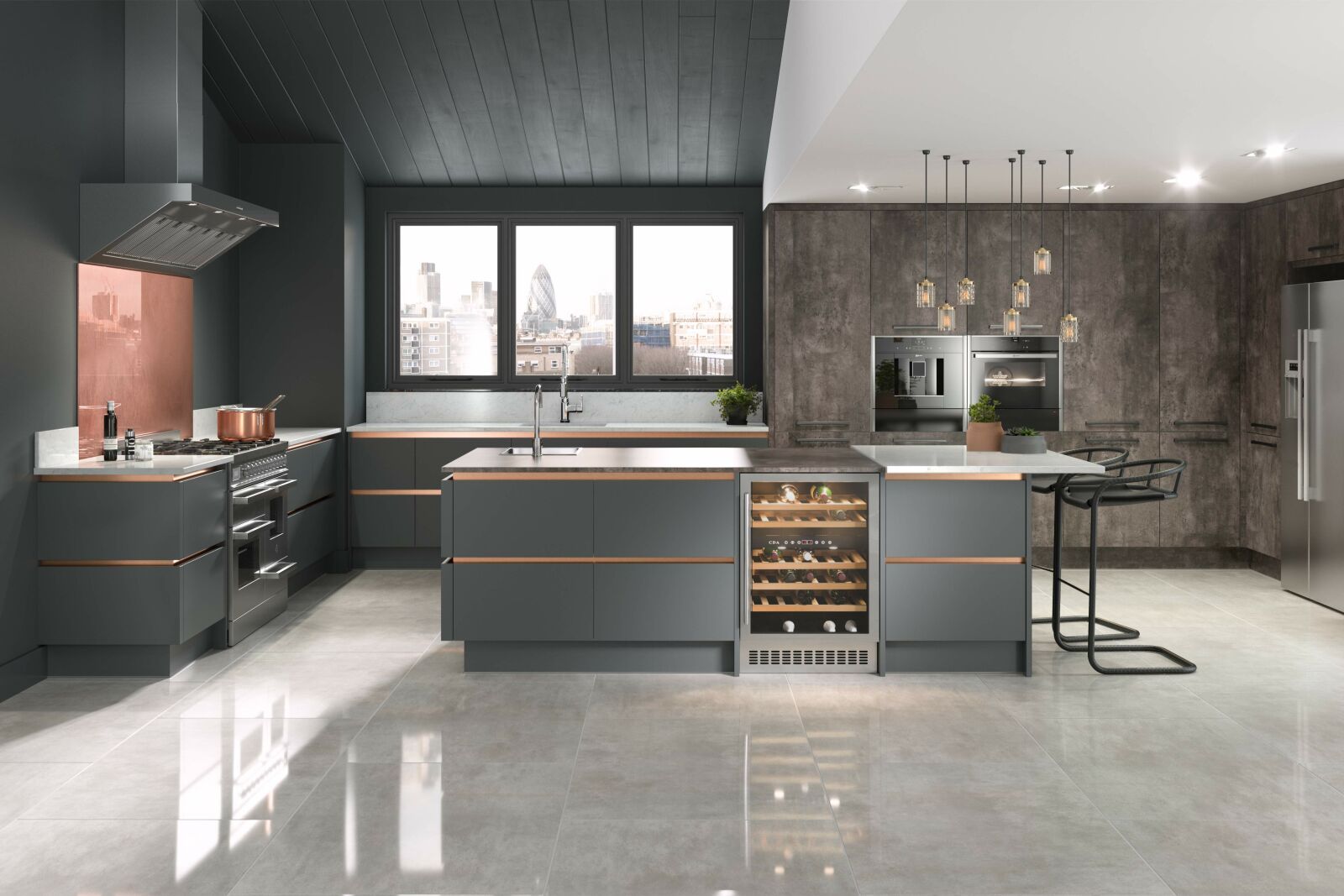 与魅力,厨房煲一个真正的时尚元素相结合米兰与戏剧元素。米兰轮廓在城堡石带来了生命纹效果的意大利混凝土元素和铜色配件。这个时尚的厨房是一种最理想的风格在当今市场上。