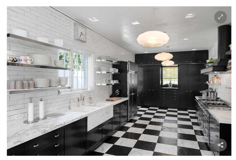 詹妮弗·安妮斯顿和布拉德·皮特在比弗利山庄的家中共用的厨房里,铺着黑白相间的大理石地板,配套的大理石台面,黑色橱柜,白色的地铁地砖,上面有灰色的注浆。