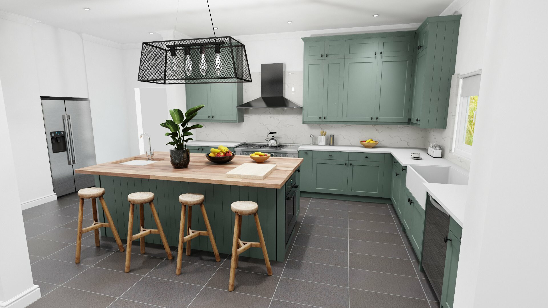 肯德尔的厨房非常奢华,有森林绿色的橱柜、铜龙头和农舍式的水槽。一个大的厨房岛提供了额外的表面空间,而豪华的大理石工作台面将设计结合在一起。